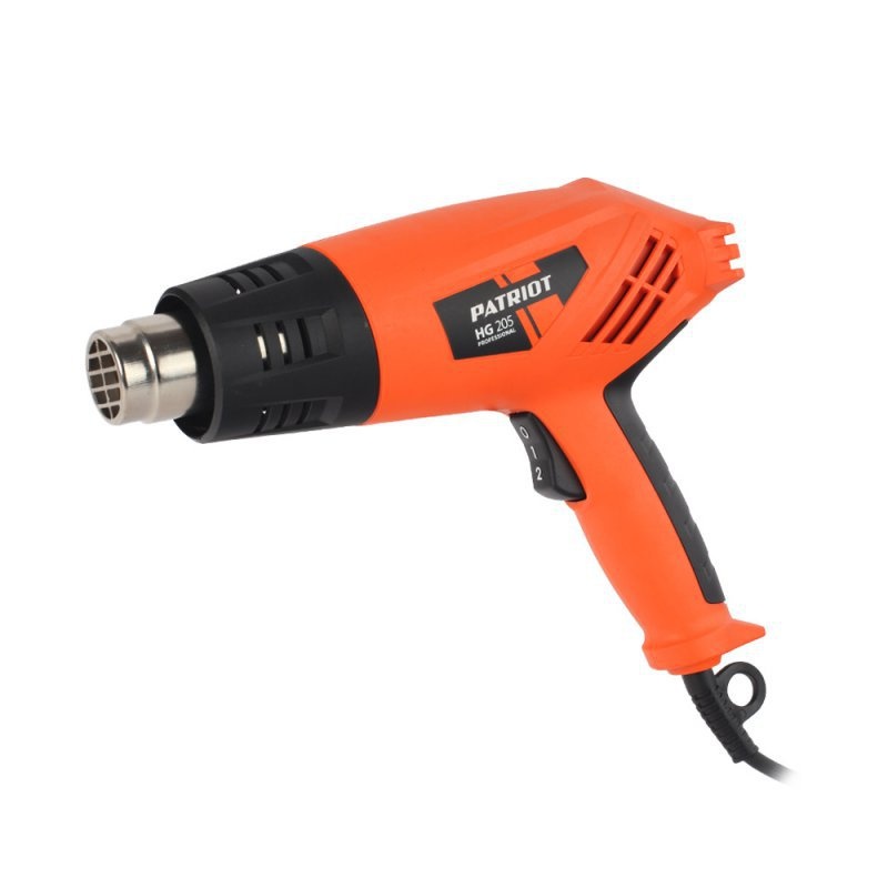 Технический фен PATRIOT HG205  с двумя режима работы используется для реставрации и отделки. Рукоятка снабжена резиновыми накладками ExtraGrip, что способствует комфортной работе пользователя. Модель можно устанавливать в вертикальное положение. Сетевой кабель устойчив к многократным перегибам. В комплект входят 2 насадки