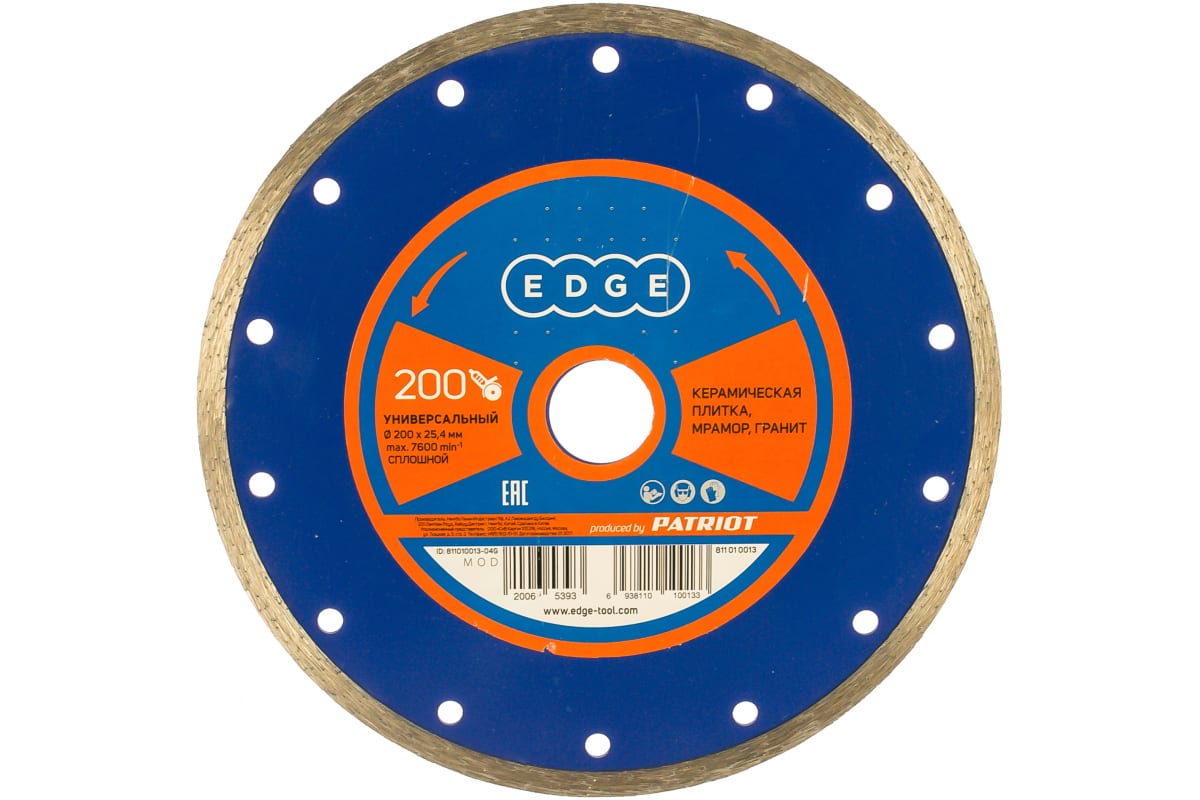 Диск алмазный сплошной EDGE by PATRIOT 811010013 предназначен для резки керамической плитки, мрамора, гранита с помощью угловой шлифовальной машины. Имеет повышенную концентрацию алмазов, что увеличивает производительность и срок службы оснастки. Высота алмазного слоя - 7 мм.
