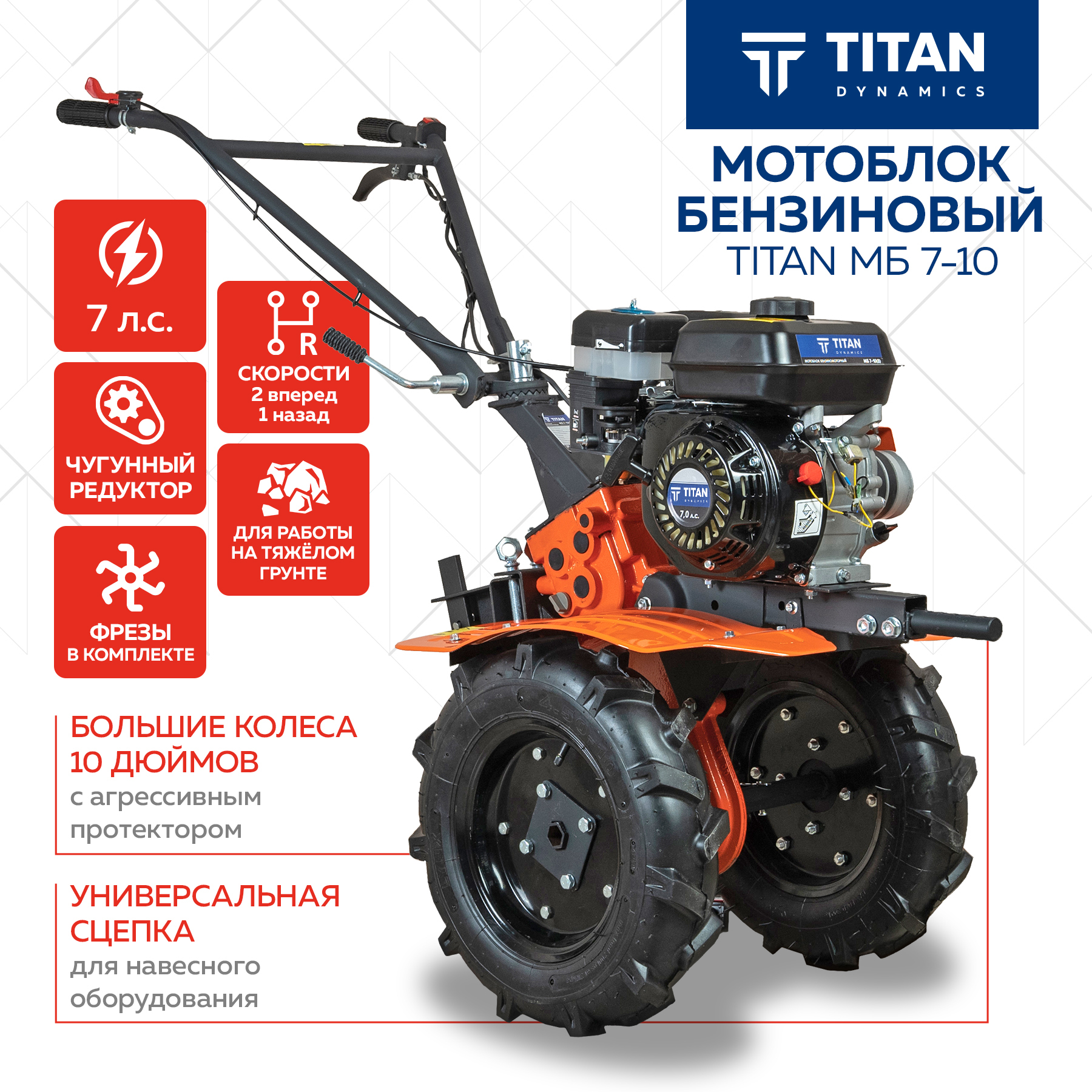 Устройство зарекомендовало себя как надежное и мощное, обладающее высокой работоспособностью и производительностью."TITAN" МБ 7-10 оснащен бензиновым четырехтактным двигателем 168F. Тип охлаждения мотора — воздушное. Мощность — 7л.с Мотоблок способен выполнять весь спектр сельхозработ: вспашка, культивация, нарезка борозд, окучивание, посадка и сбор картофеля, скашивание травы, перевозка грузов, а зимой поможет очистить участок от снега..