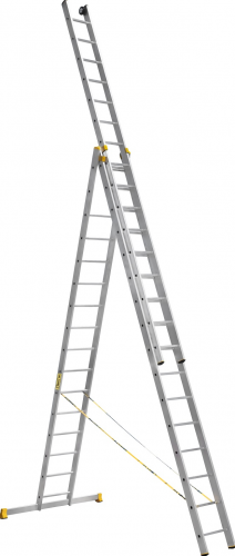 Лестница-стремянка  3х16(3х457/826/1198) это устройство относится к типу строительного оборудования. Применяется для различных работ на большой высоте. Она состоит из 3 секций по 16 ступеней, две из которых скреплены между собой специальным механизмом, а третья часть передвигается. Съемная часть применяется как приставная или удлиняющая. Преимущество такой конструкции в том, что имея большую рабочую длину, она складывается и становится в два раза меньше. Алюминиевый профиль обеспечивает стойкость и долговечность. Все крепления надежные, ступени завальцованы в профили. Дополнительные стабилизаторы и растяжки между ножками делают ее устойчивой, поэтому работающий на высоте чувствует себя уверенно.